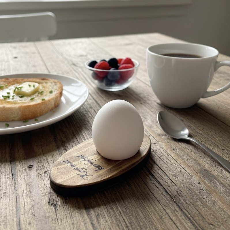 Gør din morgenmad speciel med disse smukke, ovale æggebægre i lasergraveret træ. Hvert æggebæger bærer den hjertevarme besked: “Kogt med kærlighed” (Boiled with Love).